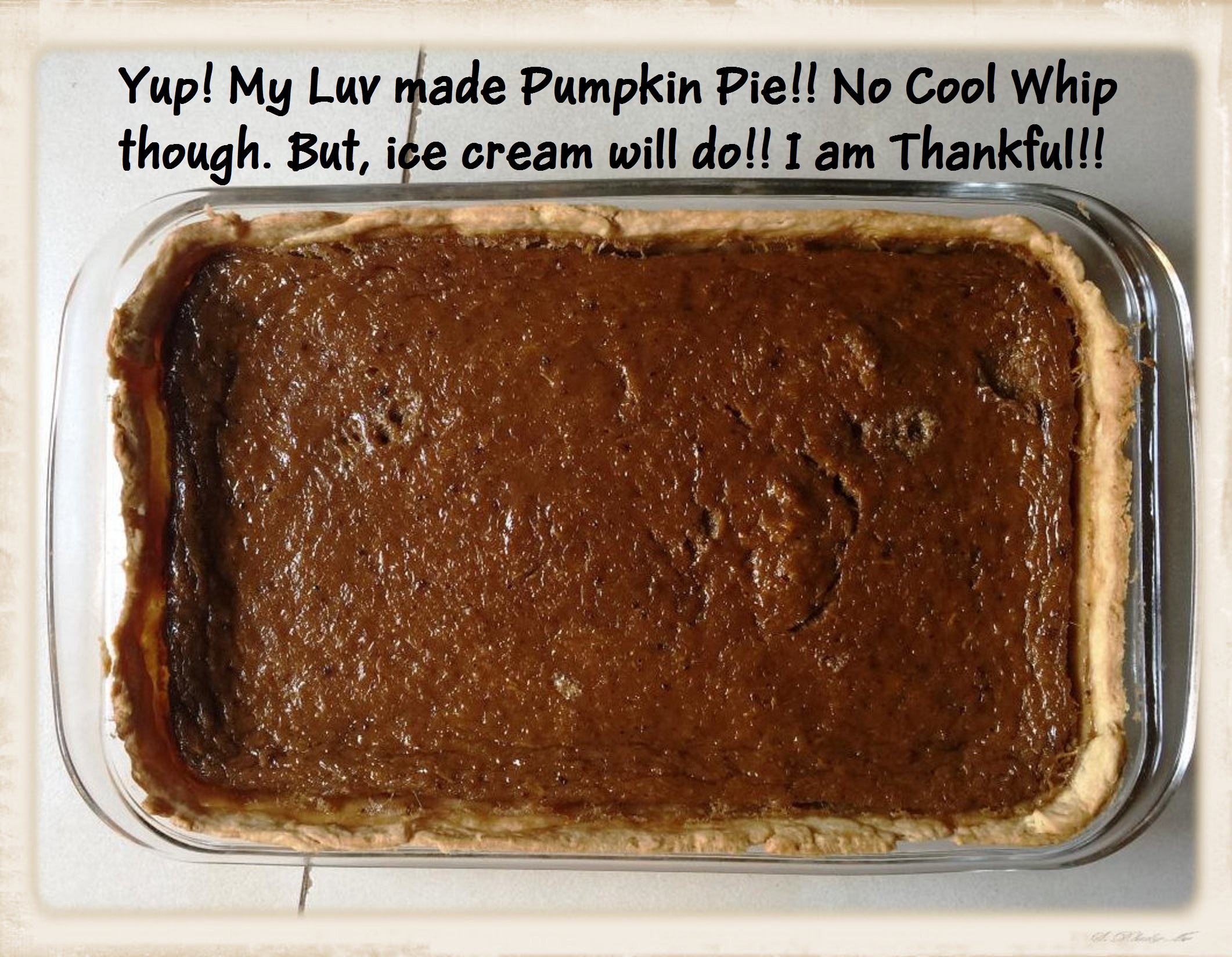 We just finished having Thanksgiving dinner (we are 10 hours ahead per MST). Debra, of course, did much with little. 2 whole Chickens (cooked like a turkey), stuffed with spices, mashed potatoes & gravy, veggie melody, NICE salads, dinner rolls, homemade cornbread muffins & of course pumpkin pie. I am stuffed! We had over Claire & Paul & our guard Enos. Small gathering, small get together, great fellowship. Today & EVERY day, we are Thankful! Happy Thanksgiving to all!